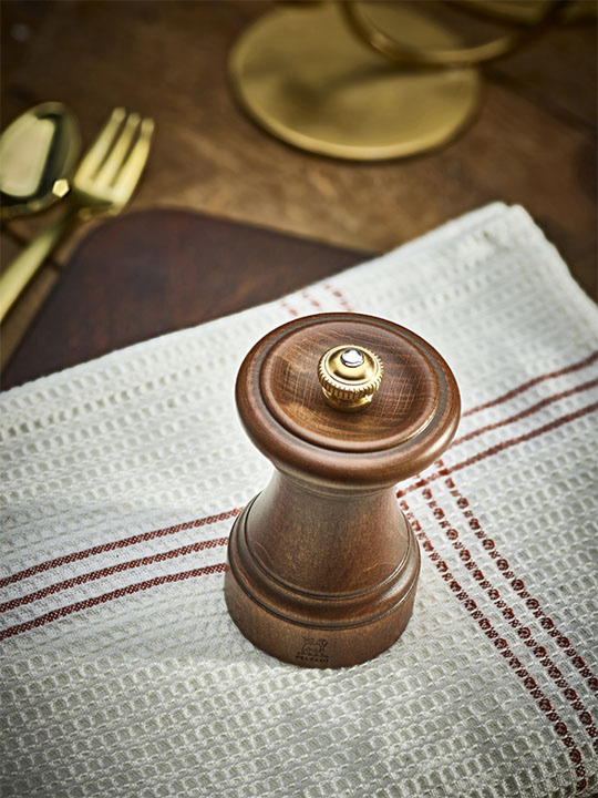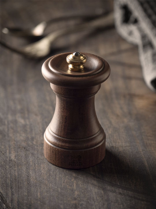 Disponible en hêtre finition patinée et présenté dans un élégant coffret, le moulin 1874 est soigneusement enveloppé dans une sachet de feutrine, offrant protection et charme intemporel. La touche finale de cette réédition est apportée au niveau du bouton bijou, fidèlement reproduit à partir de l'original. Il ajoute une note élégante au moulin dont on note la forme incurvée du chapeau.