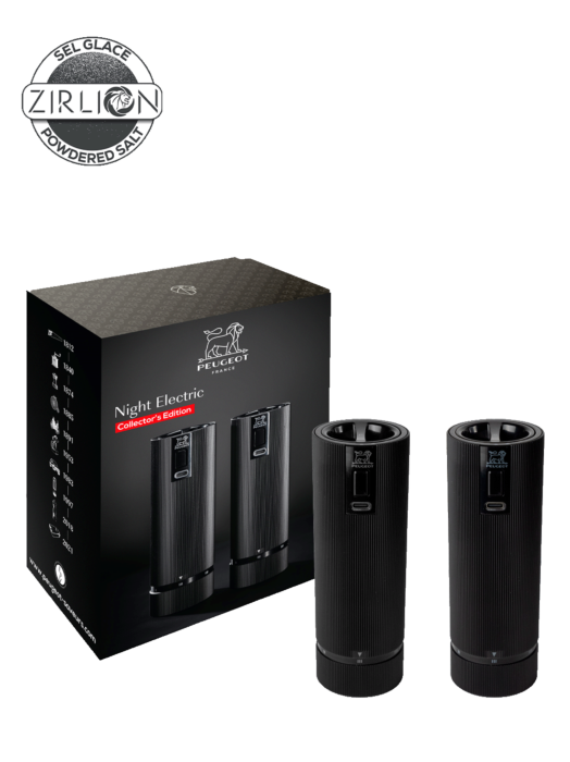 A inscrire dans votre wishlist ou à offrir à vos proches amateurs de design et de gastronomie, le coffret Night électrique fera l’unanimité. Avec ce duo de moulin à poivre et à sel électriques vous êtes sûrs de ne pas vous tromper. Ligne d’une élégance rare en aluminium strié habillé d’un noir mat particulièrement chic, le duo de moulins électriques Line noir mat est ingénieux du remplissage à la mise en marche. Tout est pensé dans le moindre détail : un design compact pour une prise en main optimale, une autonomie longue durée et un temps de charge rapide grâce à la batterie lithium ion dernière génération, un remplissage intuitif grâce à la forme en entonnoir du réservoir. Son mécanisme en Zircone, innovation de la Recherche et Développement Peugeot permet de délivrer du Sel Glace, d'une finesse extrême, offrant ainsi le plaisir gustatif du sel en limitant la quantité utilisée. Son système de réglage de mouture u'select, également exclusif à Peugeot, offre 6 positions de réglage pour ajuster au mieux la finesse de la mouture de votre sel sec, du sel glace au sel croquant. Mécanisme ZIRLION, garanti sans limitation de durée. A offrir sans modération et pour toutes les occasions.